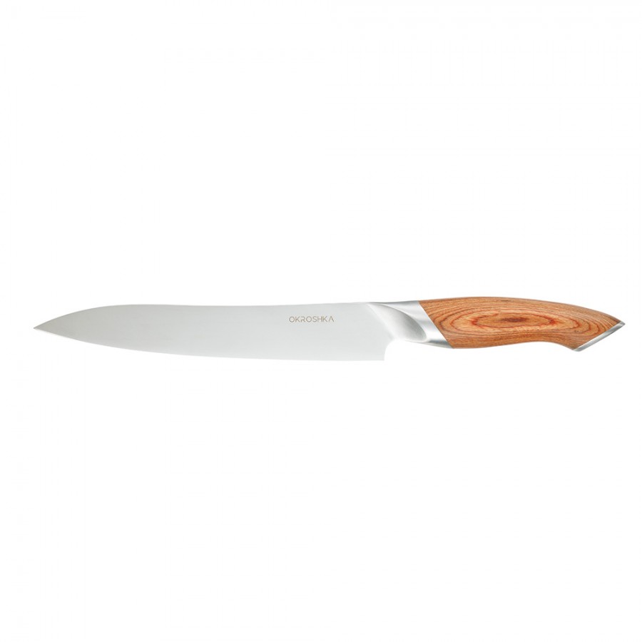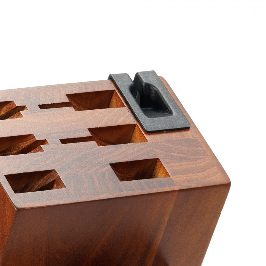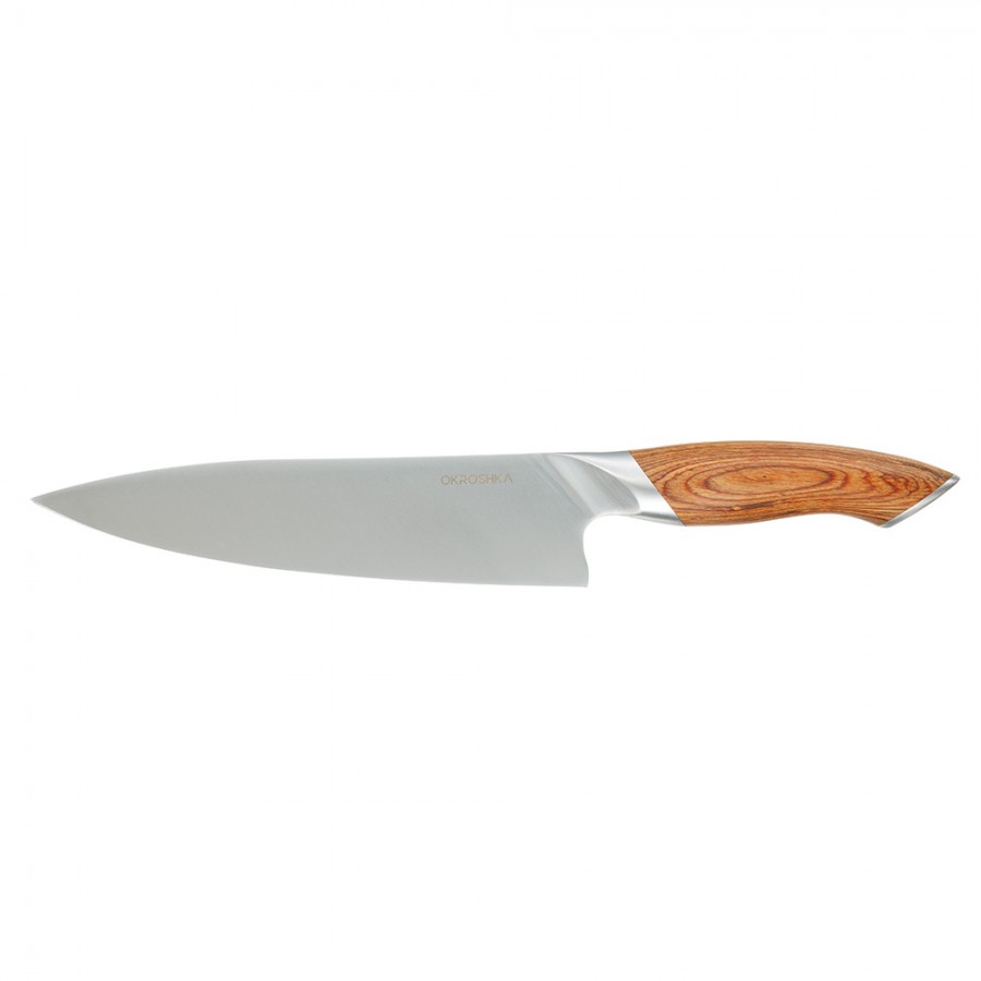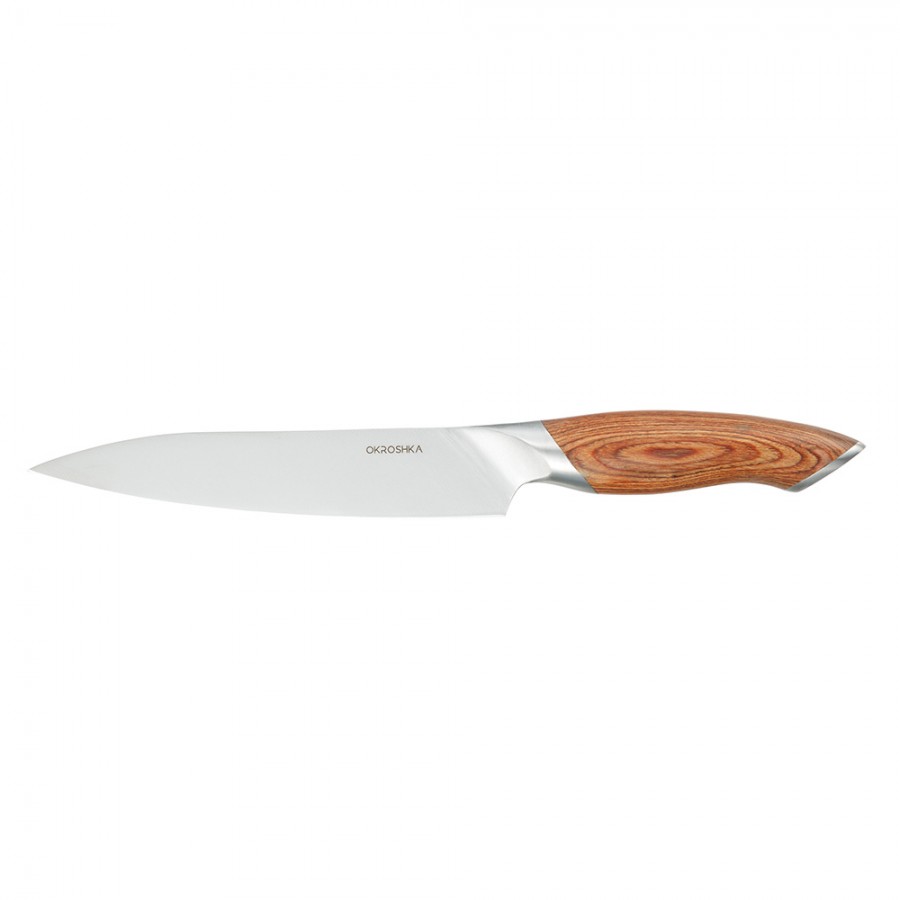 Набор кухонных ножей с подставкой, 7 предметов Набор кухонных ножей ТРЮФЕЛЬ — это воплощение утонченного стиля и продуманного комфорта в одном решении. В комплекте собраны основные ножи для любых кулинарных задач, дополненные практичной подставкой и ножницами. Баланс форм, острые лезвия из стали 9Cr18Mov и теплые деревянные ручки Пакка делают процесс готовки удобным и вдохновляющим. Пакка — композитный материал на основе древесины, пропитанной специальными смолами. В отличие от обычного дерева, Пакка устойчив к влаге: не впитывает воду, материал не расширяется и не сжимается при изменениях влажности. Подставка из натурального дерева тик не только удобно организует хранение ножей и ножниц, но и подчеркивает премиальный характер набора, добавляя кухне стиль и теплоту натуральных материалов. Этот набор — не просто инструмент, а полноценная основа для домашней кухни: от нарезки хлеба до филигранной разделки рыбы. ТРЮФЕЛЬ объединяет эстетику, надежность и практичность, превращая ежедневное приготовление пищи в удовольствие. В набор входят: Нож сантоку, лезвие 17,8 см Нож поварской, лезвие 20,5 см Нож хлебный, лезвие 20,6 см Нож филейный, лезвие 20,9 см Нож универсальный, лезвие 15,2 см Нож для овощей, лезвие 9,5 см Ножницы кухонные Подставка с точилкой