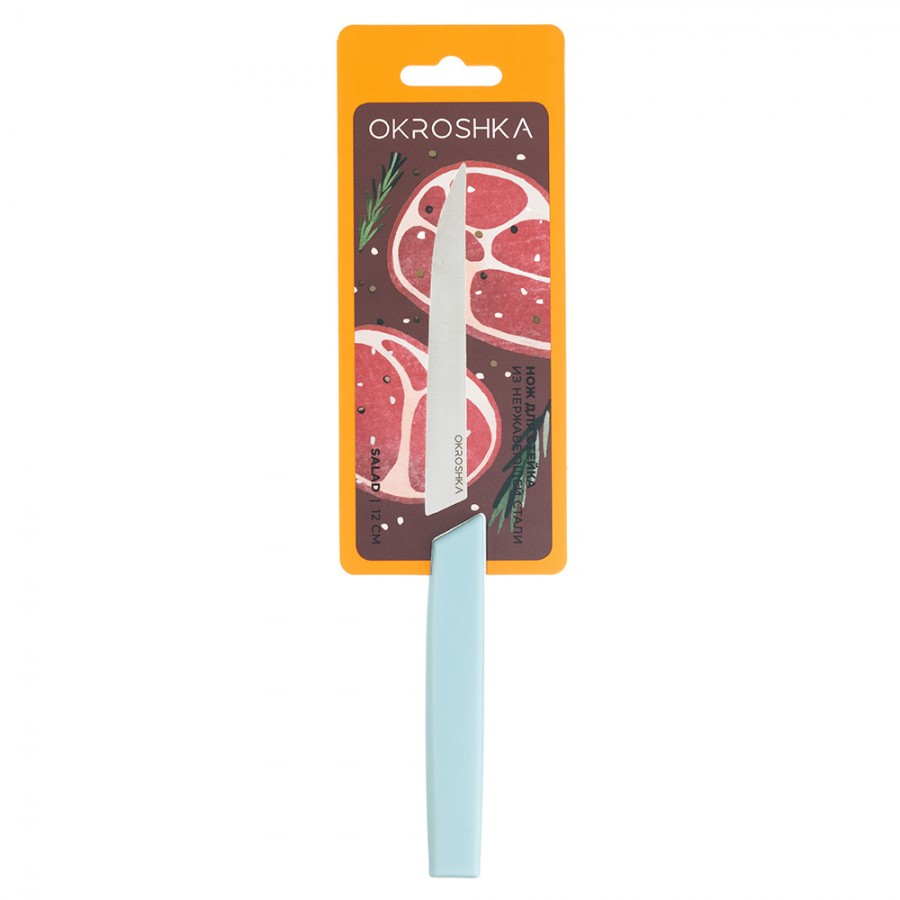 Нож для стейка OKROSHKA САЛАТ - идеален для подачи и нарезки мясных блюд. Длина лезвия: 12 см Серия САЛАТ — это коллекция ножей с яркими цветными ручками, созданная для живой и современной кухни. В линейке представлены столовые ножи, ножи для фруктов, овощей и стейков. Лезвия выполнены из высококачественной нержавеющей стали 5Cr15MoV, некоторые модели оснащены серрейторной заточкой для удобства работы с разными продуктами. Эргономичные ручки обеспечивают комфортный захват и делают процесс приготовления простым и приятным. Эти ножи компактные, надежные и универсальные — на каждый день и для любых блюд.