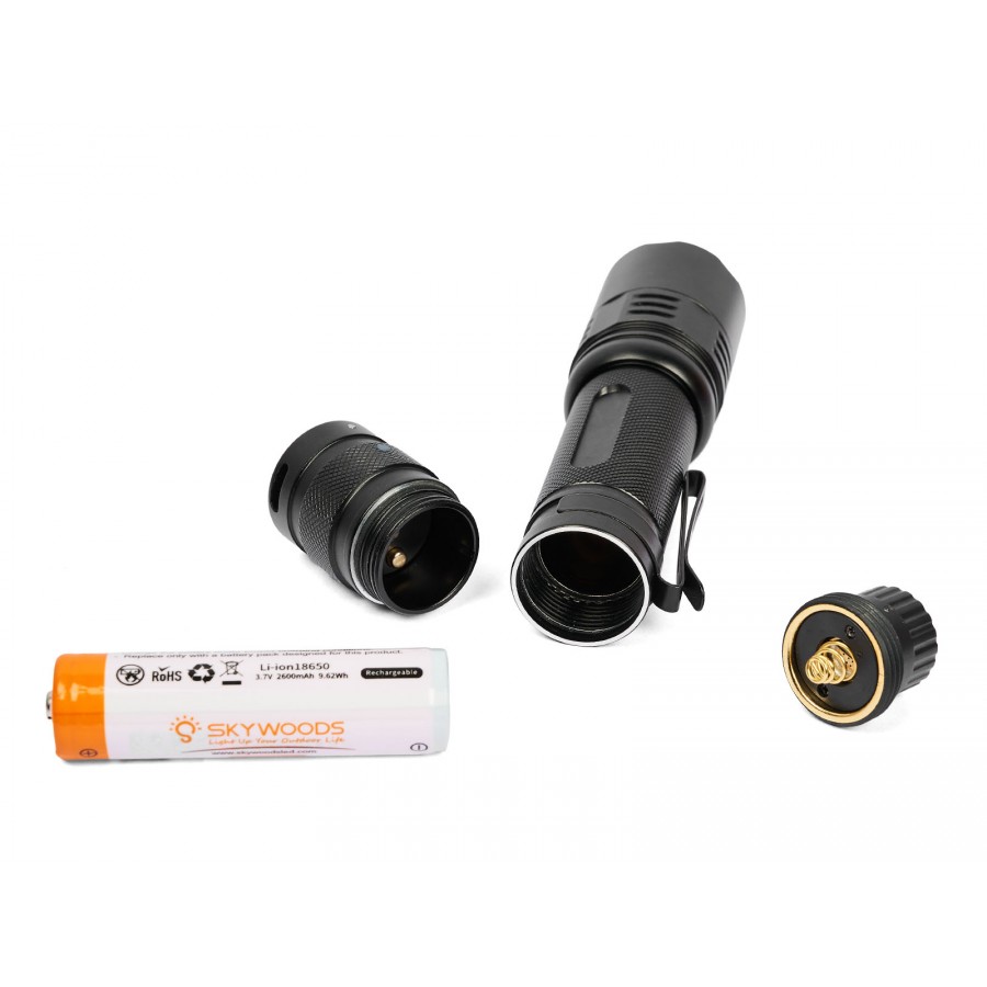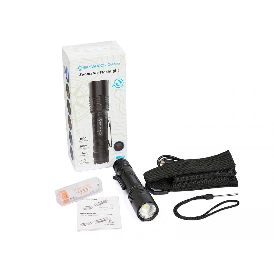 Фонарь SKYWOODS TACTIC 1800, Аккумулятор 18650, Прищепка, Темляк, Чехол на ремень тканевый, Шнур USB-C.